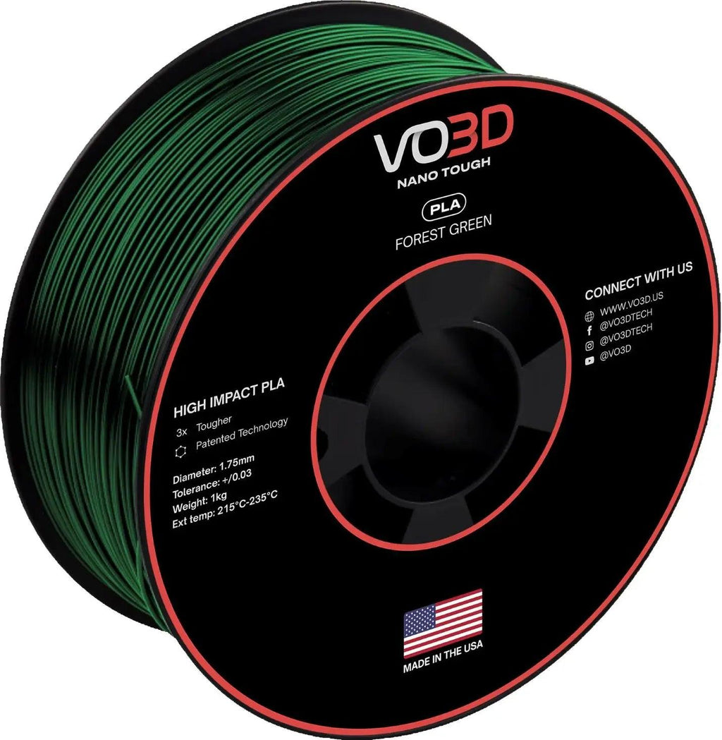VO3D PLA filaments are manufactured in the US to the highest quality standards and currently come in six colors.